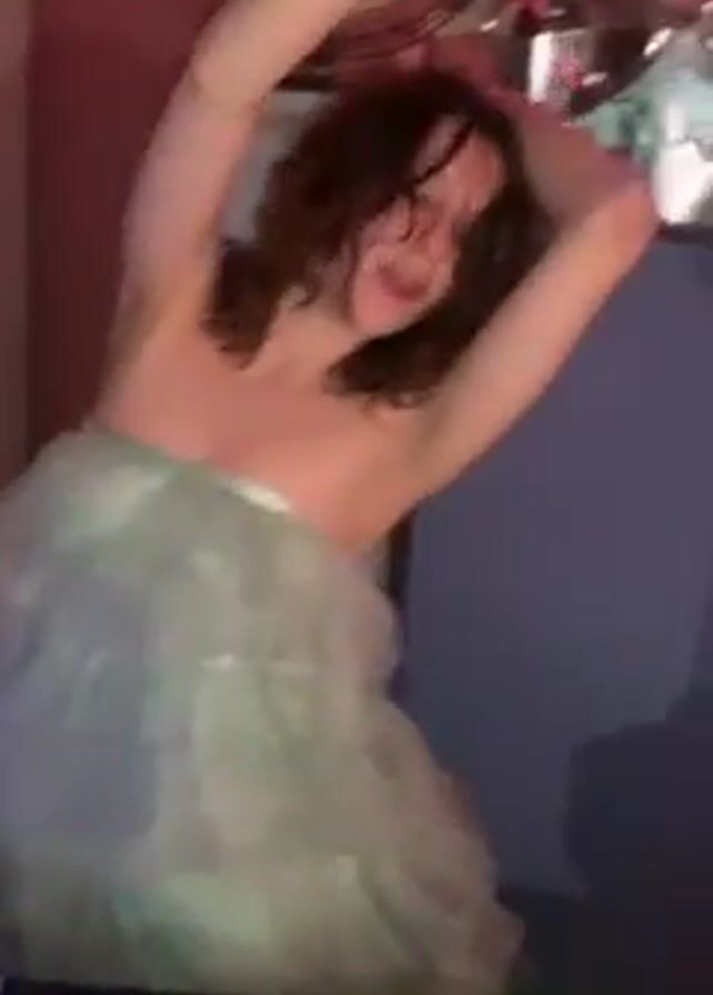 A blurry video shows a party. There is a DJ setup on a table with multiple buttons and knobs. A woman is dancing in front of the DJ setup, wearing a strapless, pale green, multi-layered tulle dress. A man in a black, semi-sheer, button-down shirt and a crossbody bag is also dancing. He later puts on sunglasses. There are red lights and shiny tinsel decorations on the walls. A fan is visible in the background.