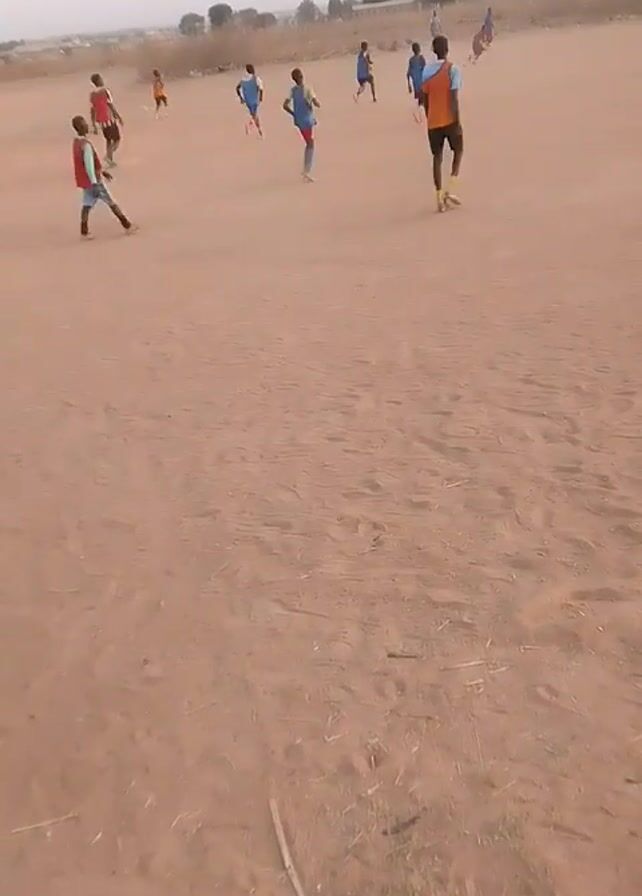 group of young people playing soccer on a dirt field. They are wearing various colored jerseys, and the field is mostly bare with some scattered vegetation. In the background, there are a few trees and buildings. The camera is stationary, providing a wide shot of the field. The players are spread out, running and kicking the ball. The sky is overcast, giving the scene a neutral lighting.