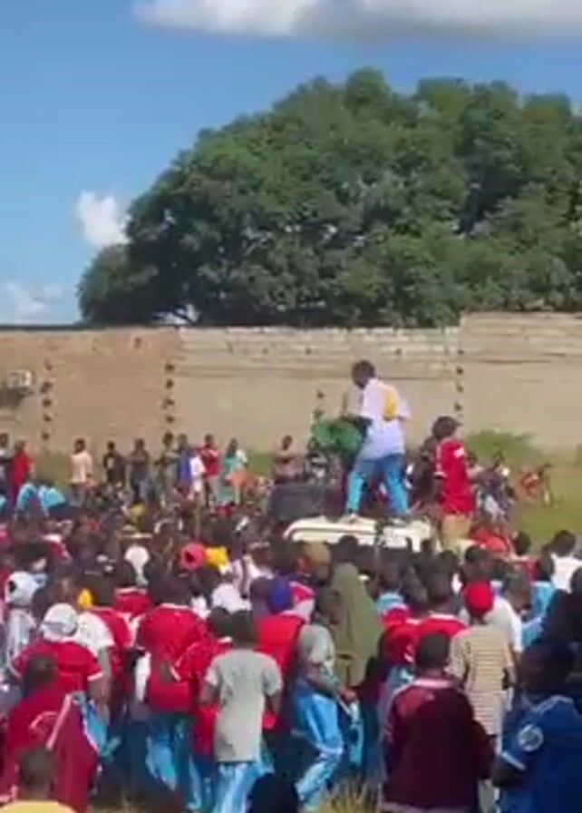 A large crowd of children, mostly wearing red or blue uniforms, are gathered outdoors on a sunny day. A man in a white shirt and blue pants is standing on top of a white vehicle, interacting with the crowd. A brick wall is in the background with a large tree nearby. The sky is blue with some clouds. The ground is grassy.