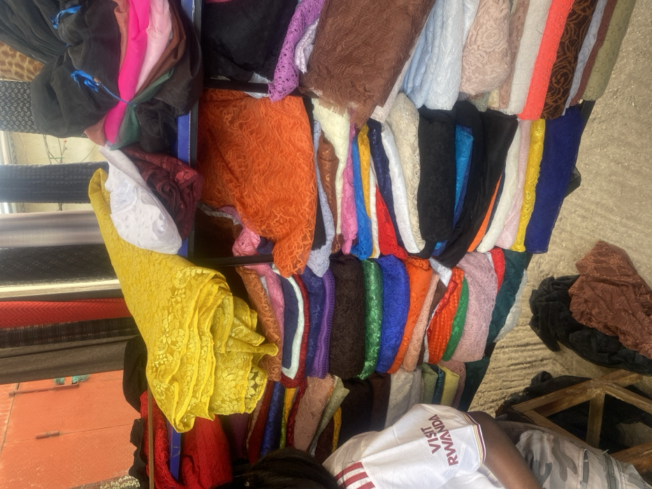 A colorful array of fabric bolts are neatly displayed on tiered shelving. The fabrics, largely lace, showcase vibrant hues of yellow, orange, red, blue, purple, and black. Other fabrics, including silk, are stacked to the left. The view is partially obstructed by a person wearing a white shirt with "VISIT RWANDA" imprinted on it, suggesting a market or shop setting.