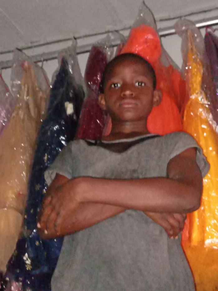 A young boy stands with his arms crossed, looking directly at the viewer. He's wearing a gray shirt. Behind him, a rack holds various colorful garments, each individually wrapped in clear plastic. The colors include orange, yellow, maroon, and navy blue. The overall impression is one of a confident youth amidst a display of clothing.