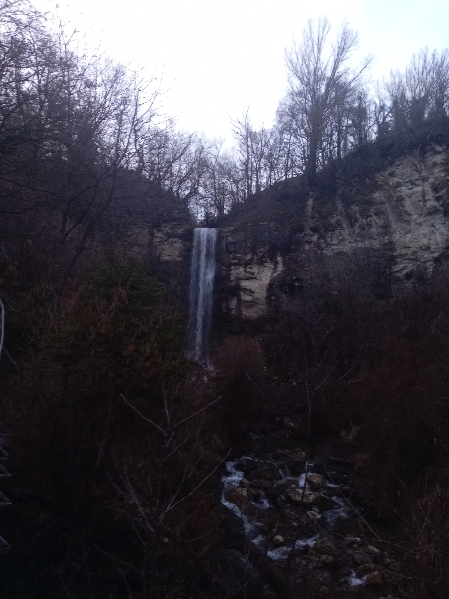 The image depicts a waterfall in a wooded area. The waterfall cascades down a rocky cliff face, surrounded by bare trees and dense shrubbery. A small stream flows from the base of the falls. The sky is overcast and the lighting is dim. The location is assumed to be in the city of Smolyan, Bulgaria.