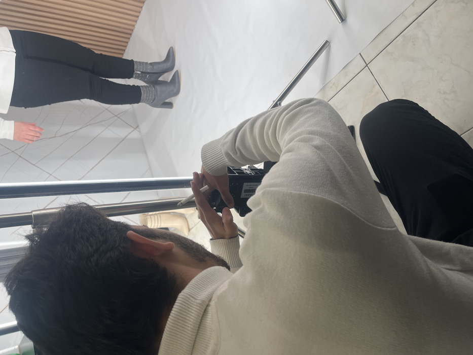 A person with dark hair, wearing a white hoodie and black pants, appears to be adjusting a camera. The camera is mounted on a tripod. The person is holding a cigarette in their hand. In the background, a woman in black leggings and gray heeled boots is partially visible, possibly posing for the camera. The setting includes a white surface, potentially a backdrop, and a tiled floor.
