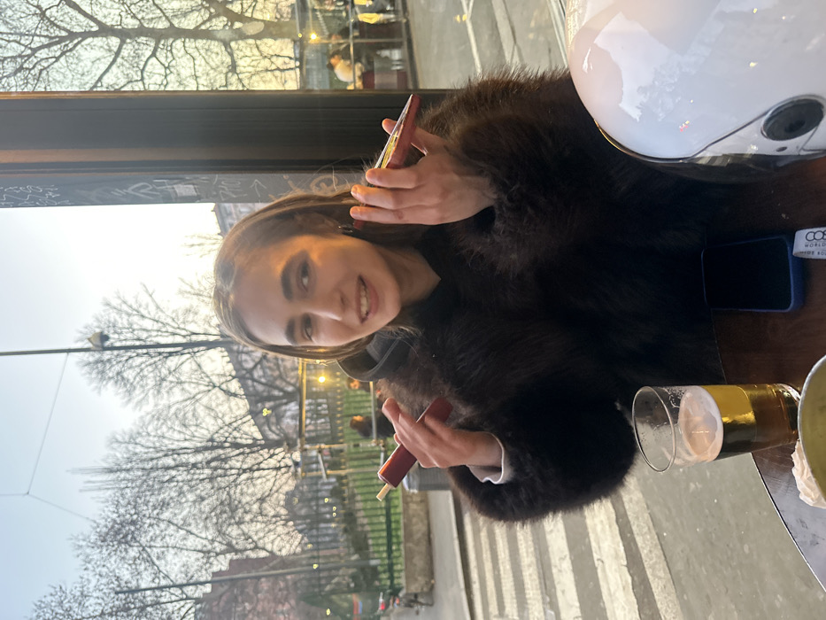 The image displays a young adult female seated at an outdoor table of a commercial establishment in an urban area during dusk or early evening. **Location:** The background reveals a street scene bordered by a public park featuring bare deciduous trees, indicative of late winter or early spring. Behind the park, multi-story buildings with light-colored facades and typical European architectural elements are visible. A pedestrian crossing is present on the street pavement. This urban setting is consistent with a city environment in Milan, Italy. **People:** A female individual, appearing to be in her late teens or early twenties, is centered in the frame. She has long dark hair and is smiling, looking directly at the camera. She wears a dark, possibly faux fur, coat or jacket over a dark hooded garment. A white shirt cuff is visible on her left wrist. Other individuals are discernible in the distant background, some seated at outdoor tables, others walking on a sidewalk. **Objects and Actions:** The female holds a cylindrical red object, consistent with an electronic cigarette or vape, featuring a lighter-colored tip, in her raised left hand. In her raised right hand, she holds a red smartphone, positioned as if recording a voice message or on a call. On the dark wooden table in front of her, from left to right, are: a transparent glass containing an amber liquid with a foam head, resembling beer; a blue smartphone lying face down; a white rectangular object partially obscuring text, with "WORLD" visible; and the front portion of a white motorcycle helmet with a dark visor. A crumpled green or yellow object is also partially visible on the table's left edge. **Environment:** The background includes a dark metal fence enclosing the park. Beyond the fence and trees, multiple-story buildings are visible under a sky gradient from light blue to pale orange/yellow. Artificial illumination from streetlights and commercial establishments is present. A dark vertical column or frame with light markings stands to the right of the primary subject. Reflections of trees and lights are visible on glass panels separating the outdoor seating area from the street.