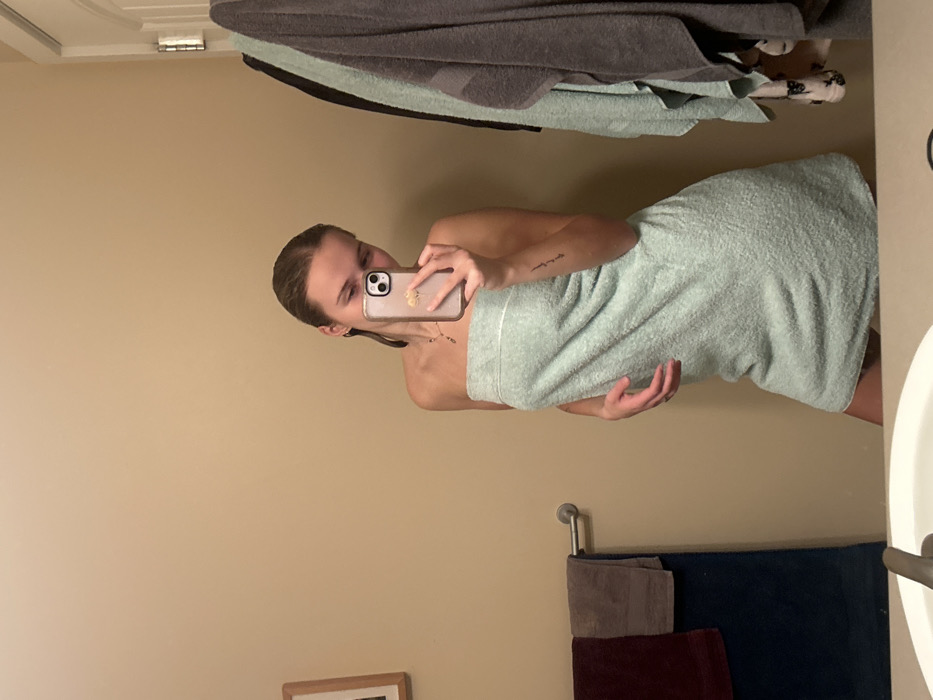 - "A woman wrapped in a light green towel takes a selfie in a bathroom mirror" by FM-p02Wp2, licensed under CC BY 4.0