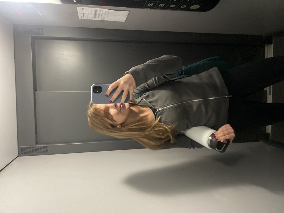 The image depicts an adult female taking a mirror selfie inside an elevator, located in Aldoar, Foz do Douro e Nevogilde, Portugal. The subject is a light-skinned female with long, light brown hair styled with bangs. She wears a dark gray zippered hoodie over a dark undershirt and black leggings. A small gold stud earring is visible in her left ear, and her fingernails are painted red. She is holding a light blue smartphone with a dark case in her right hand, obscuring part of her face as she photographs her reflection. In her left arm, she carries a large white insulated water bottle with a black handle. A dark green tote bag is visible slung over her left shoulder. The elevator interior features light grey walls. The rear wall consists of two sliding grey metal doors with a central vertical seam. To the right of these doors, a vertical vent with horizontal slats is present. Further right, a black elevator control panel with square buttons and what appears to be a digital display is partially visible. A white document is taped to the wall near the control panel. The lighting suggests an overhead source, casting a shadow from the subject's head onto the left wall.