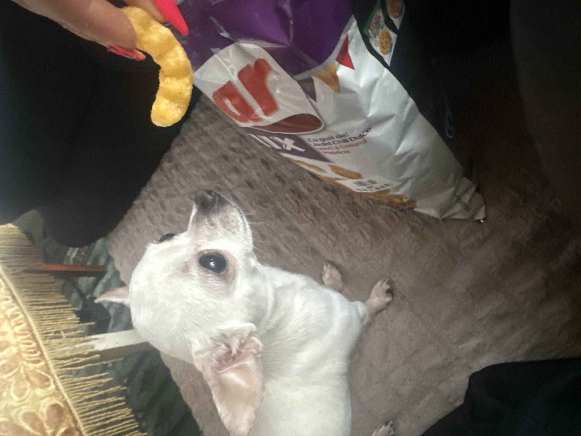 A person is holding a cheese puff near a white Chihuahua that is looking up with anticipation. Beside the person is a bag of "Mix" chips. The scene is set on a brown surface, possibly a couch or rug. No information indicates that this image was taken in Skala, Bulgaria.