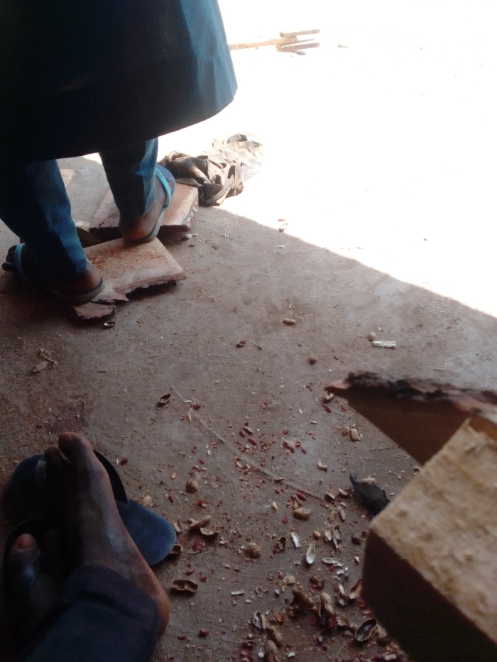 This image depicts a ground-level view of an outdoor or semi-enclosed area, specified as a city in 0801712591, Nigeria. The scene is dominated by a concrete or dirt floor littered with numerous discarded peanut shells, small wood shavings, and miscellaneous debris. A strong diagonal shadow line divides the frame, indicating intense direct sunlight on the upper right portion. Two individuals are present, evidenced by their lower extremities. In the upper left, a person wearing dark blue trousers and light-colored flip-flops stands with one foot resting on a rough-hewn wooden plank. Behind their feet, a dark, crumpled object, possibly a bag, lies on the ground next to additional wood pieces. In the lower left, a bare, dark-skinned foot in a dark blue flip-flop rests on the ground amidst the debris. In the lower right foreground, a piece of wood with its bark edge intact is partially visible. The presence of wood, shavings, and the casual posture of individuals suggests a workspace or common area where woodworking and casual eating of peanuts occur.