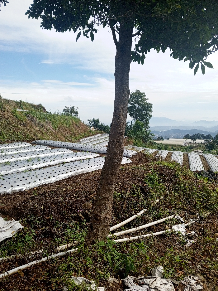 A hillside agricultural landscape features rows of crops covered in white plastic with holes. A tree stands in the foreground, partially obscuring the view. Below the tree, scattered white pipes and debris lie on the ground amidst greenery. In the background, distant mountains and a city are visible under a hazy sky with scattered clouds.
