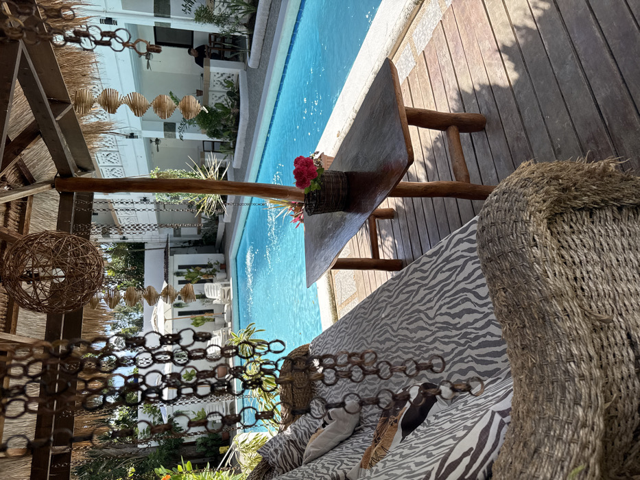 This image depicts an outdoor recreational area, likely part of a resort or guesthouse, in Panglao, Philippines. The scene is captured during daylight hours, indicated by bright illumination and shadows cast on the wooden deck. In the immediate foreground on the left, a woven natural fiber lounge chair or swing is visible, fitted with cushions featuring a prominent zebra-print pattern. Directly in front of this seating, a vertical decorative chain composed of dark, interconnected rings hangs. To the right of the seating, a rustic, dark-stained wooden table with visible grain rests on the wooden deck. On this table, a small, dark woven basket contains a cluster of vibrant red flowers. The midground features a rectangular swimming pool with clear, bright blue water, exhibiting ripples from an active water feature. The pool is bordered by light-colored coping. Beyond the pool to the left, green tropical foliage and an orange flowering plant are present, along with a white sun umbrella and two white lounge chairs. In the background, a series of white, multi-story buildings with decorative architectural patterns are visible, suggesting guest accommodations. Under a thatched roof structure, several spiral-shaped wooden hanging decorations are suspended, alongside a large spherical woven light fixture. To the far right, partially obscured, a single male individual is seated at a counter or table, facing away from the primary vantage point. He is wearing dark clothing and appears to be engaged in a solitary, seated activity. The foreground elements, including the lounge chair and table, are situated under a thatched roof supported by wooden posts, providing shade. The overall environment suggests a leisure setting.
