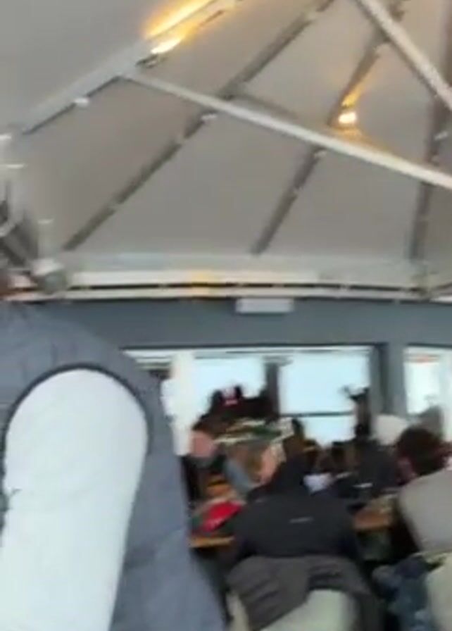 interior of what appears to be an outdoor cafe, with people sitting at wooden tables and some standing. The roof is white and has a metal structure. People are wearing winter clothing, including jackets and vests, suggesting it is cold. Some individuals have ski helmets and goggles, indicating they may have been skiing. In the beginning, a person in a blue puffer jacket and another in a gray vest pass by the camera. Then the camera focuses on a table where three men are standing, interacting with a man sitting at the table, possibly checking his gear. The cafe seems crowded with other patrons at various tables. The overall mood is lively, potentially a post-ski gathering.