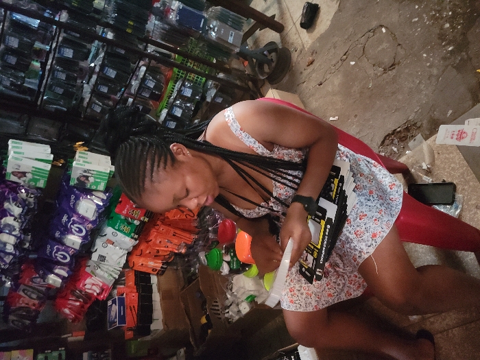 A female subject is seated on a red plastic stool inside a retail shop in Fegge, Nigeria
