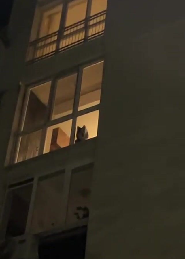 exterior of a building at night. The focus is on a three-story section of the building with lit windows. A cat is visible sitting on the windowsill of the middle window, looking out. The building has a light-colored facade. There are some air conditioning units visible below the windows. The sky is dark.