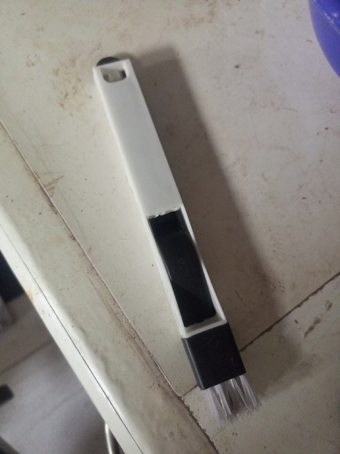 A small, narrow cleaning brush rests diagonally on a dirty, textured surface. The brush has a white, rectangular handle with a hole at the top. A black section divides the handle from the brush head, which is also black. The bristles of the brush are light gray. A portion of a blue object is visible in the upper right corner of the frame. The overall scene suggests a cleaning task.