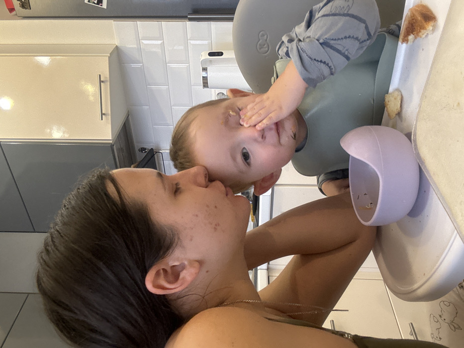 The image depicts an indoor scene within a modern kitchen. An adult female, with dark hair, positioned to the left of the frame, leans in to kiss the forehead of a young child. The female exhibits several dark spots on her left cheek and is wearing a light-colored top with a thin silver chain necklace. The child, seated in a grey high chair with a white tray, wears a grey long-sleeved shirt and a light green silicone bib. Food residue is visible on the child's forehead, left cheek, and chin. The child's left hand is raised, covering his left eye and part of his nose. On the high chair tray, a small, light purple silicone bowl containing minimal food remnants is present, alongside several scattered pieces of bread-like material and a larger spread of light-colored, possibly pureed food. The background consists of a kitchen area featuring white subway tile backsplash with dark grout, two-toned upper cabinets (a dark grey glossy unit to the left and a light beige unit with a silver handle to the right), and a silver range hood beneath the dark cabinet. A portion of a stainless steel refrigerator is visible on the far right, next to a white and silver electric kettle or similar appliance on the countertop. A white floor mat with grey sheep patterns is partially visible beneath the high chair. No discernible visual elements within the image definitively identify its specific location within the city of Odintsovo, Russia.