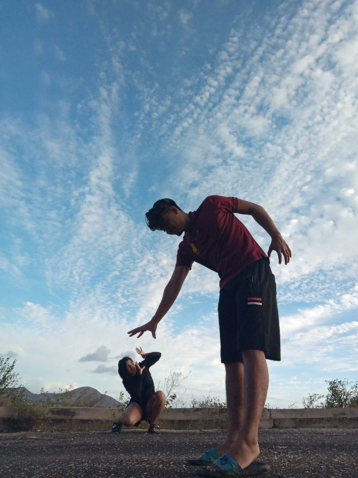 The scene is set outdoors on a dark, textured asphalt-like surface in Altagracia, Venezuela. A male subject occupies the right foreground, viewed from mid-thigh upwards. He is dressed in a dark red polo shirt with a yellow emblem and black shorts featuring a white and red stripe on the left leg. He wears light blue sandals. The male is bent forward at the waist, extending his right arm downwards and to the left with an open hand. In the left background, a female subject is crouched low to the ground, facing the male. She is clad in dark clothing and has both arms raised with open hands, positioned defensively near her head. The background consists of a low concrete barrier, sparse green vegetation, and distant, hazy hills, all beneath a bright blue sky patterned with numerous small, scattered white clouds.