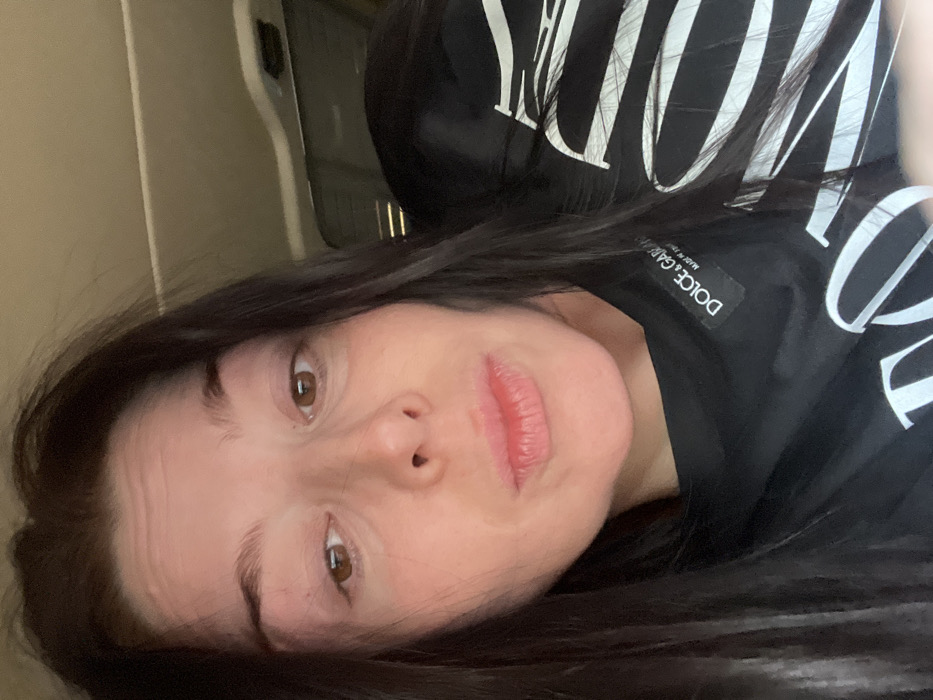 An adult female subject is depicted in a close-up, head-and-shoulders frame, looking towards the camera. She has long, dark hair and brown eyes, with faint lines visible on her forehead and beneath her eyes. Her lips are slightly pursed. She is wearing a black garment, likely a t-shirt, which features a black label bearing white text "DOLCE & GABBANA" and "MADE IN ITALY." Partially visible large white letters are also present on the garment. The background is an indistinct, light-colored interior space, possibly a vehicle cabin, with a light-toned ceiling element visible in the upper right quadrant. The scene is located in Castiglione della Pescaia, Italy.