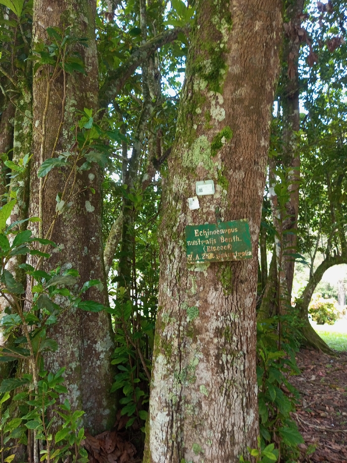 The image depicts a close-up, eye-level view of a wooded area, specifically a botanical or natural zone within the city of Serchhip, India. The primary subject is a large tree trunk situated prominently on the right side of the frame. Its bark is coarse, brown, and textured, extensively covered with patches of light green and white lichen and moss. Affixed to this trunk are two small, white rectangular tags, likely identification markers or containing QR codes. Below these tags, a larger, rectangular green plaque is attached, displaying white text that reads "Echinocarpus australis Benth. (Elaeoca)" and, on a lower line, "N. A. Z. S. Serchhip, India." To the left, a second, similarly textured tree trunk is partially visible, adorned with green vines or climbing plants. The background comprises dense green foliage and additional tree trunks, suggesting a forested or garden environment, with natural light filtering through the canopy. The ground beneath the trees is covered with fallen leaves and minimal undergrowth. No individuals are present, and no specific actions or interactions are depicted.