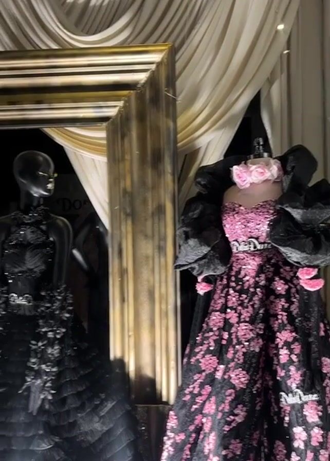fashion display in a storefront window. There are three mannequins dressed in formal gowns. The dresses are all black with floral or ruffle embellishments. A gold frame sits between the mannequins. Draped white fabric is visible behind the mannequins. The video appears to be taken from outside of the store window.