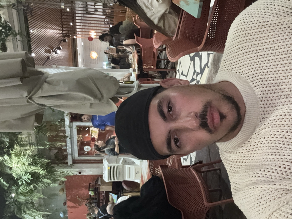The image depicts an indoor or semi-outdoor restaurant or cafe setting in Holon, Israel, likely during the evening. In the foreground, a male individual is centered, looking directly at the camera. He has dark hair covered by a black durag or headwrap, a mustache, and a soul patch, and is wearing a cream-colored, open-knit long-sleeved sweater. The background reveals a busy dining area. To the left, several individuals are seated at tables with reddish-brown plastic chairs. A person in black attire is partially visible, seated with their back to the camera. Further back, a white portable air cooler unit stands near a red wall adorned with plants and decorative elements. Through a glass entrance, a man in a blue shirt and a woman in a dark shirt are observed standing. Overhead, dense green foliage hangs, contributing to a lush aesthetic. To the right, more patrons are seated at various tables, engaging in dining or conversation. These tables are also accompanied by reddish-brown plastic chairs. A large, folded, light-colored patio umbrella structure occupies a significant portion of the midground, partially obscuring the view into the establishment's interior. The floor displays a distinctive black and white patterned mosaic. Beyond the seating area, through another glass partition, the interior features warm lighting, including exposed bulbs and track lighting, and a textured wall with vertical wooden slats.