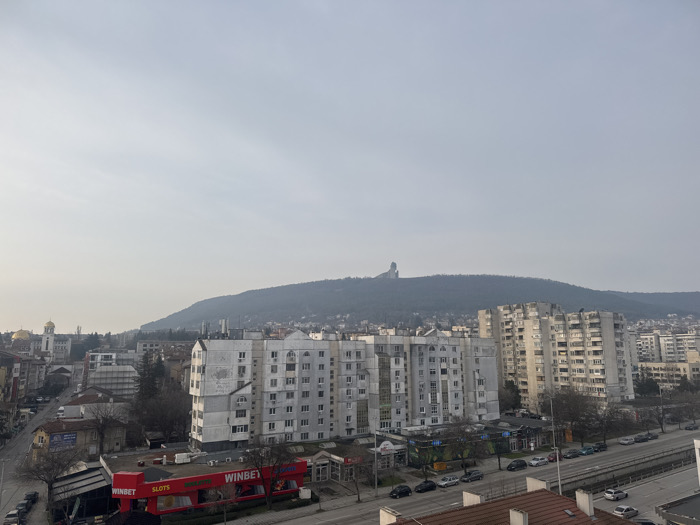 The image displays an elevated, wide-angle view of the city of Shumen, Bulgaria, under an overcast sky