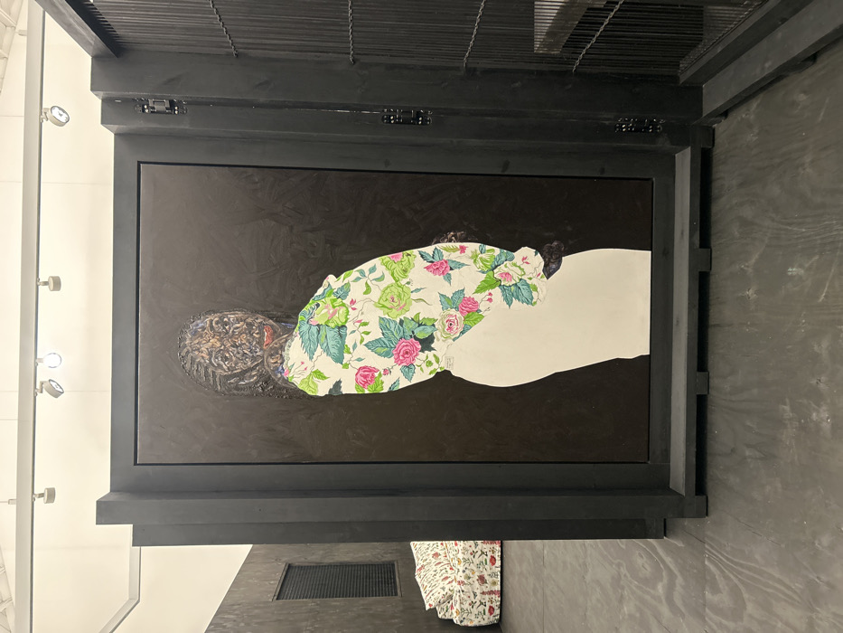 A framed painting dominates the scene, depicting a figure against a black background. The figure has dark, textured hair and wears a floral-patterned garment with white sleeves. Pink and green roses are prominent in the fabric design. The painting is enclosed in a thick, black frame that appears to be part of a larger, dark-colored structure or enclosure. The setting looks like a gallery or exhibit space.
