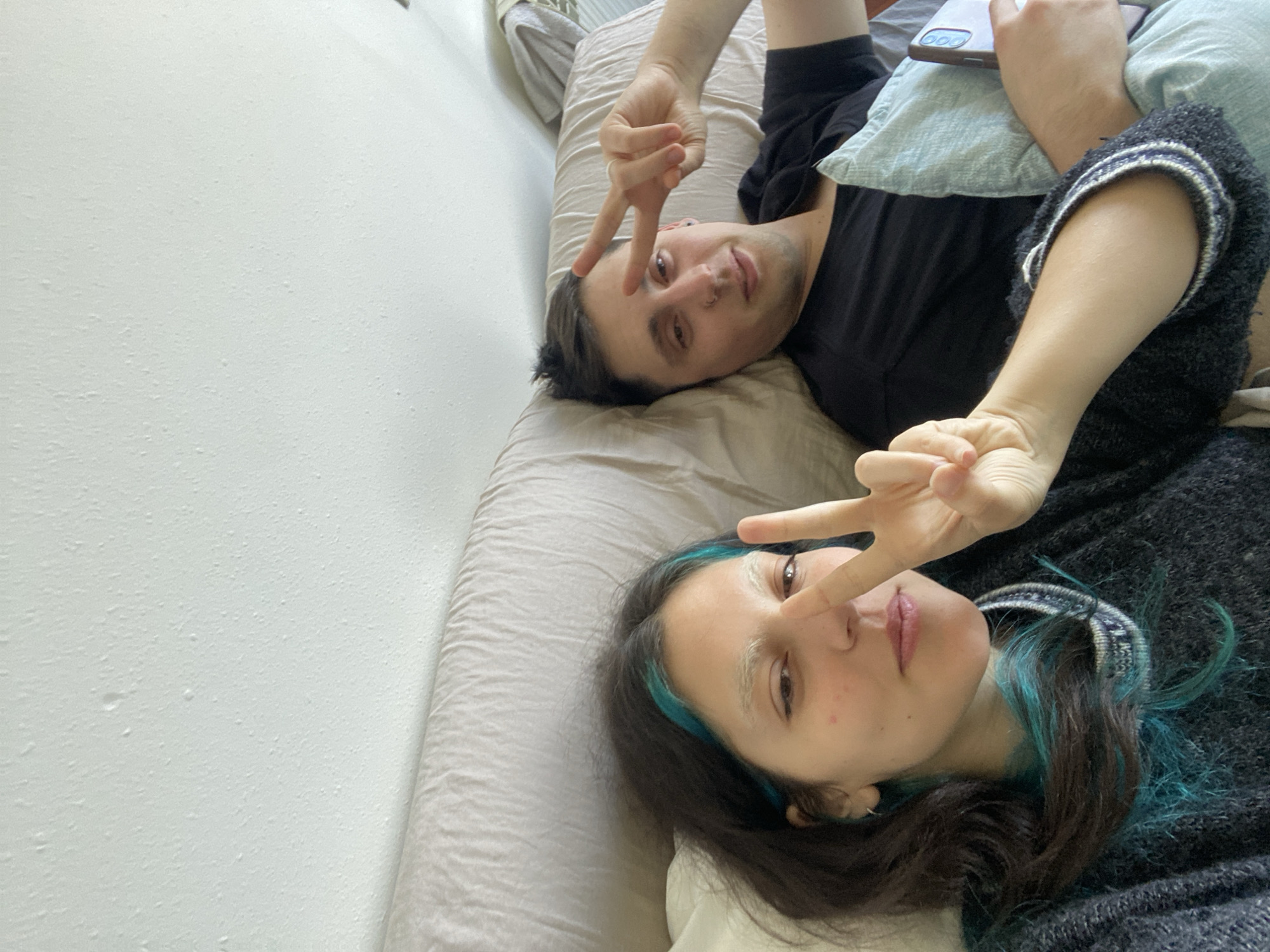 Two people are lying on a bed. One person has dark hair with blue streaks and a gray sweater. The other person has dark hair and is wearing a black shirt. Both people are making a peace sign with their fingers. A smartphone is lying on the bed next to the person in the black shirt. The location is not identifiable as Gijón/Xixón, Spain.