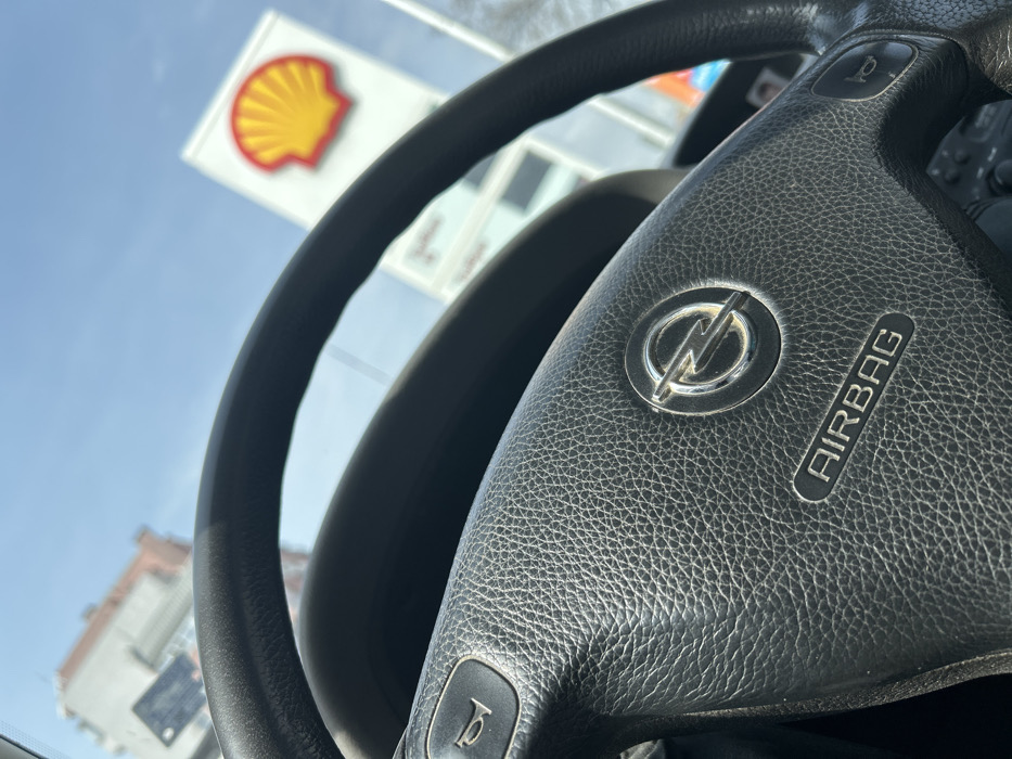 The image displays the interior of a vehicle, specifically an Opel steering wheel, prominently centered and in sharp focus. The steering wheel is black, textured, and features a silver Opel emblem in its center, with the word "AIRBAG" embossed beneath it. Horn buttons are visible on the left and right spokes. The view is through the vehicle's windshield, presenting an out-of-focus background under a clear blue sky. A large, white sign featuring the distinctive red and yellow Shell scallop logo is visible on the right side of the background, indicative of a fuel station. A light-colored building with a reddish roof is partially visible in the left background. No individuals are present in the frame. The scene is located in the city of Unknown, Unknown.