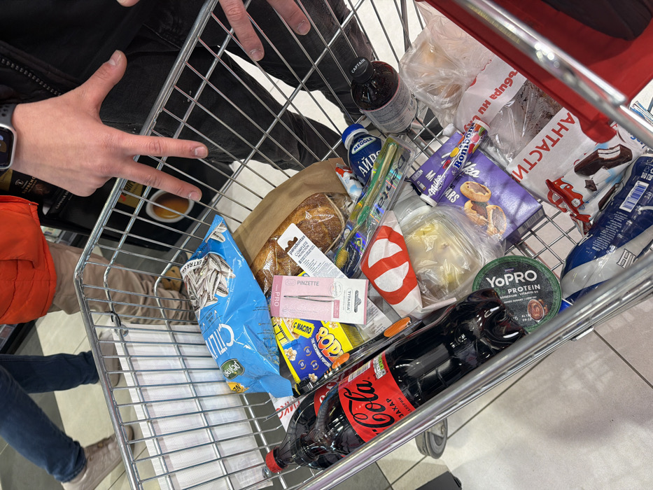 - "The scene depicts the interior of a supermarket in Ivanyane, Bulgaria, viewed from above a metal shopping cart filled with various grocery items" by FM-I3gjr1, licensed under CC BY 4.0