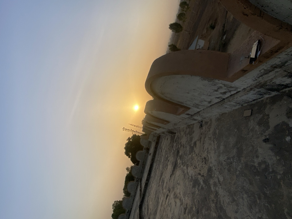The image depicts a panoramic view of Barako, Nigeria, at either sunrise or sunset, characterized by a bright yellow sun low on the horizon. The foreground consists of a textured, dark grey concrete surface, possibly a rooftop. A decorative wall or parapet runs diagonally across the midground, featuring light grey blocks with reddish-brown arched coping stones. On one of these coping stones, a dark electronic device, likely a smartphone or power bank, is visible with a white cable attached. A small, light brown rectangular object rests on the concrete surface near the wall. In the background, silhouetted against the warm, gradient sky (light blue transitioning to yellow-orange), are trees, several tall communication towers to the left of the sun, and an open, sparsely vegetated landscape to the right, which includes a distant small, light-colored building. No individuals are present.