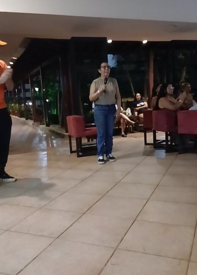 woman speaking into a microphone in a well-lit lobby-like area. She is wearing a light-colored top, blue jeans, and dark sneakers. A few people are seated around red chairs and tables in the background, while others are standing and clapping. An additional woman in a red dress joins her. The floor is tiled and there are decorative black squares in the ceiling. Outdoor vegetation is visible through a glass wall.