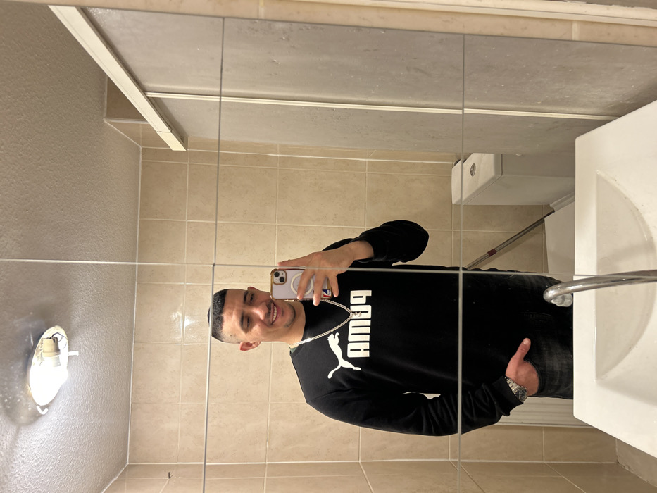 A man takes a selfie in a bathroom mirror. He is wearing a black Puma sweatshirt and a silver chain. He has short, dark hair and is smiling. The bathroom has beige tile walls, a white sink, and a toilet. The light fixture is visible on the wall, along with a cleaning mop beside the toilet.