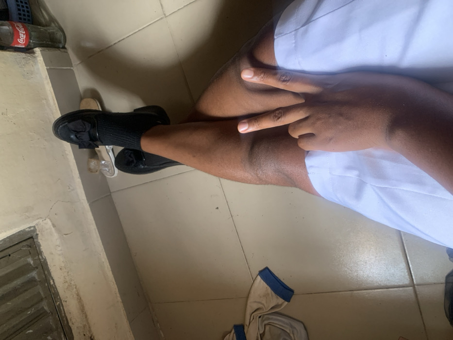 A high-angle photograph captures a partial view of an individual's lower body and surrounding indoor environment. The subject's bare legs, of darker skin tone, are crossed at the ankles, positioned centrally in the frame. The left foot is shod in a black loafer with a decorative bow on the vamp and a black sock. The right foot, similarly attired, is partially obscured. A white garment, consistent with a skirt or shorts, is visible around the upper thighs. The individual's right hand is raised, performing a peace sign gesture with the index and middle fingers extended. The flooring consists of light-colored square ceramic tiles. Along the rear wall, which is light-colored and exhibits minor stains and cracking, various objects are present. These include an empty glass Coca-Cola bottle with its red label visible, a partial blue plastic basket behind it, and a pair of light-colored sandals. To the left of the frame, a crumpled, light-colored garment with blue trim is visible on the tiled floor. The image provides no discernible visual cues to confirm the specified location of Kafanchan A, Nigeria.