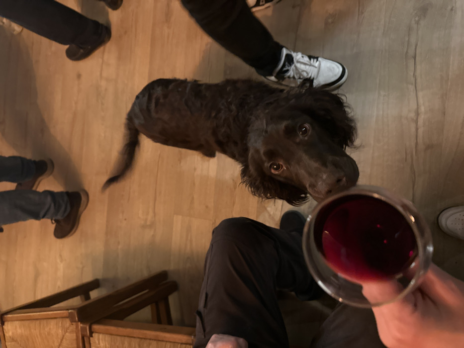 - "A brown spaniel dog looks longingly up toward a glass of red wine held in someone's hand" by FM-4J30F3, licensed under CC BY 4.0