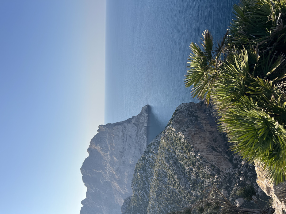 This image captures a rugged coastal landscape within the municipality of Pollença, Spain, under clear daylight conditions. The foreground consists of rocky, uneven terrain sparsely covered by green vegetation, prominently featuring multiple fan palms (Chamaerops humilis) with spiky green leaves in the lower right and dried, woody scrub on the left. The midground reveals a steep, rocky cliff face, exhibiting shades of grey and tan, with patches of green low-lying flora, descending abruptly into the sea. In the background, a large, imposing mountain range with jagged peaks and grey rock formations extends from the left, forming a distinct headland that projects into the water. The sea is a calm, deep blue, transitioning to a lighter blue towards the distant horizon. The sky above is clear and light blue, devoid of clouds. No human subjects, animals, or man-made structures are visible.