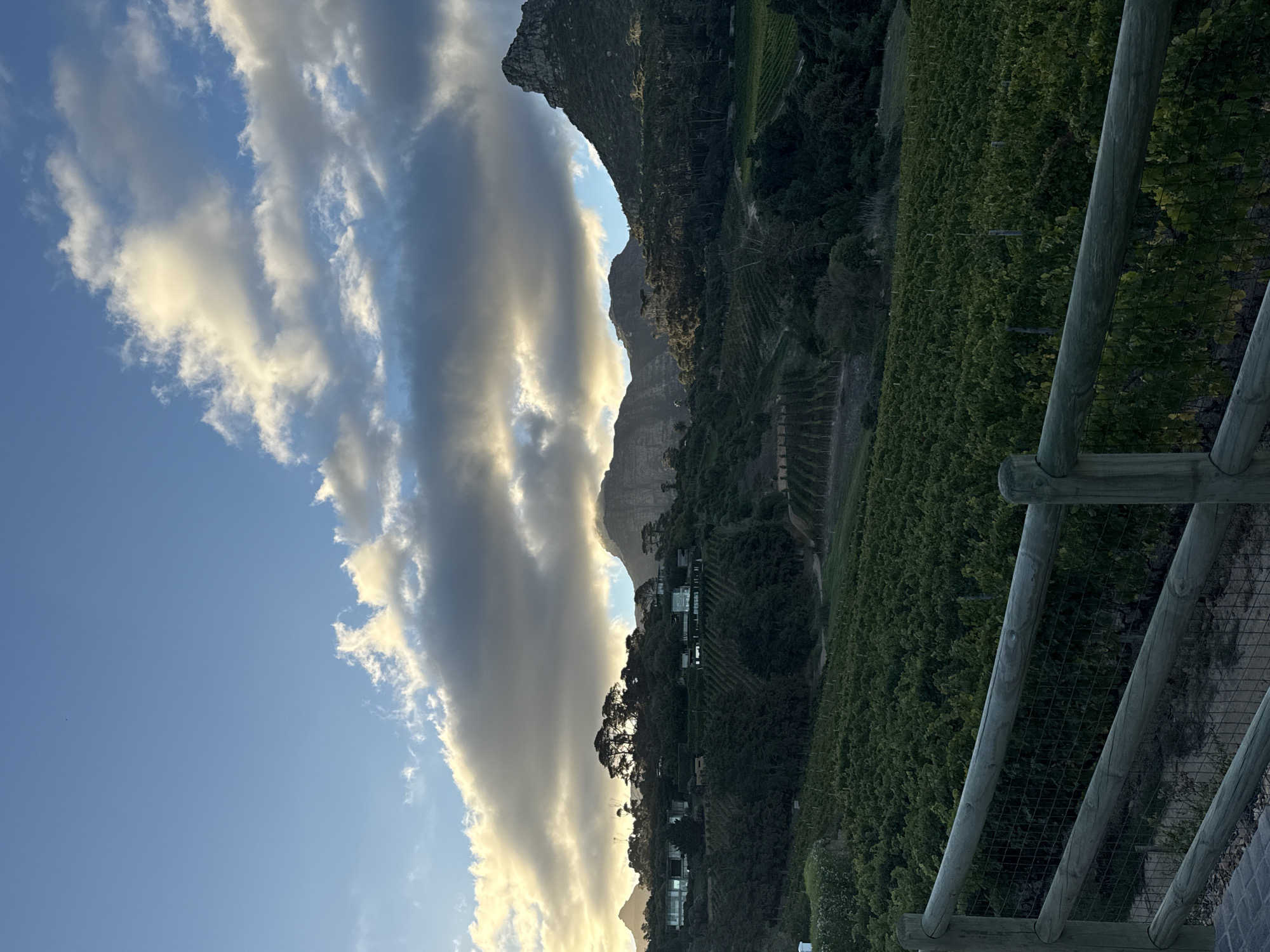The image captures a vineyard landscape under a partly cloudy sky, likely in the city of Cape Town, South Africa, given the terrain and vegetation. A section of a wooden fence is visible in the foreground. Beyond the fence lies a vineyard with rows of grapevines. The background features mountains partly obscured by clouds. Buildings are nestled among the trees on the mountainside. The sky is a mix of blue and cloudy formations, with the clouds catching the sunlight.