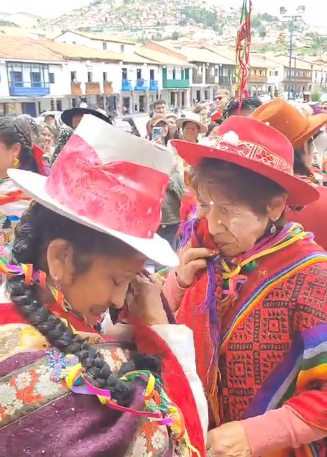 group of people celebrating in a public square. Many of them are wearing traditional Andean clothing. They include hats, colorful ponchos and intricately embroidered skirts. Some of the people have white face paint. They are dancing and interacting with one another. The square is paved with stone and is surrounded by buildings with white walls and red tile roofs. A hill is visible in the background. Colorful streamers hang overhead.