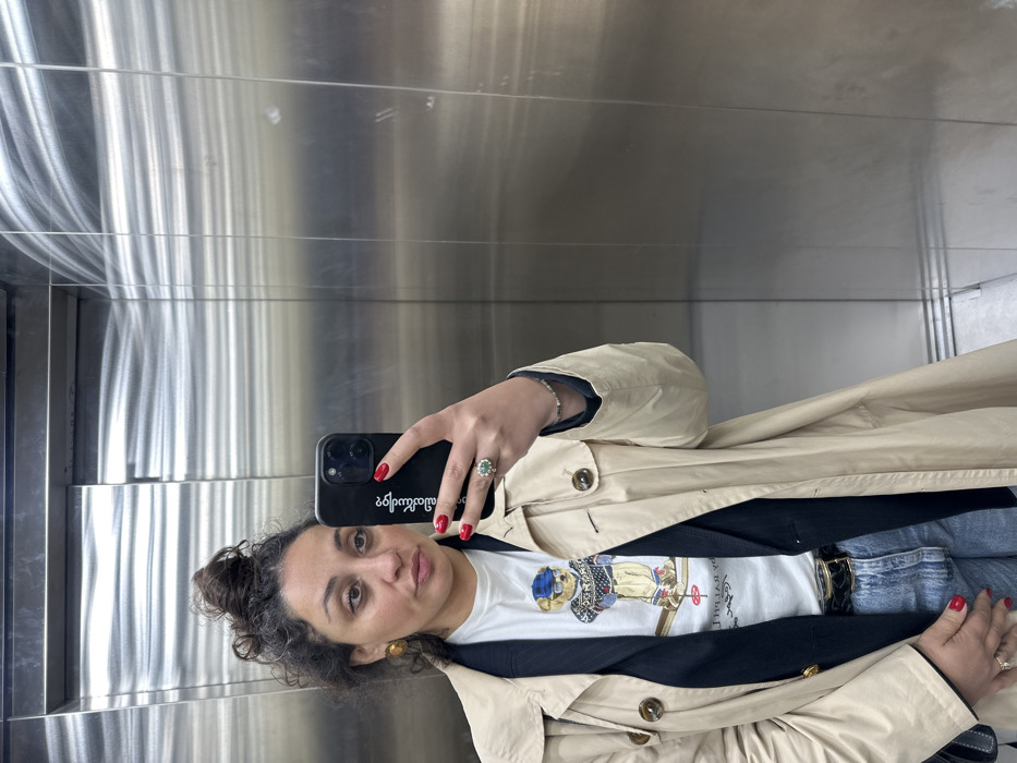 A woman poses for a selfie in an elevator. She wears a beige trench coat over a navy blazer, a white t-shirt with a cartoon bear, and jeans with a black belt. Her hair is in a messy bun. She holds a black phone with text on the case, and her nails are painted red. She wears a ring on her left hand. The elevator walls are made of brushed stainless steel.