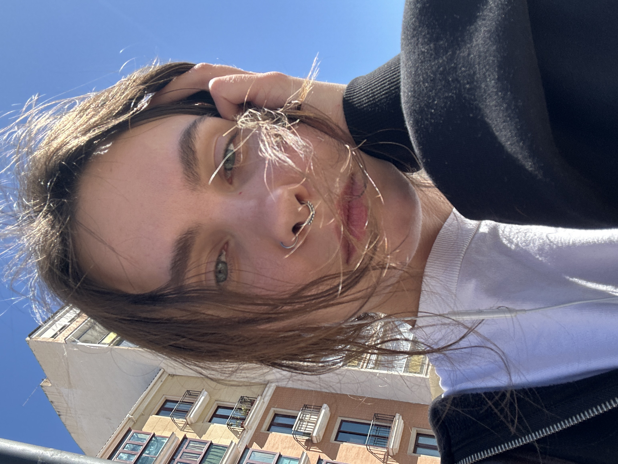 A low-angle close-up photograph shows a young, light-skinned individual with brown hair and green eyes looking down at the camera. The person has a silver nose ring. The subject is wearing a white t-shirt under a black jacket. The individual’s right hand is partially visible, touching their hair. The background reveals a clear blue sky and the upper floors of a building in Málaga, Spain, with a beige and white façade, numerous windows, and small window boxes.