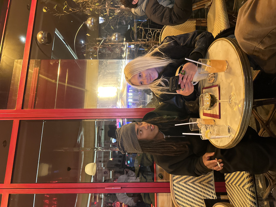 Two people sit at a round table in an outdoor cafe. A woman with long blonde hair holds a phone, while a person with dreadlocks wears a striped beanie. Drinks and a cigarette rest on the table. A red-framed glass window creates a backdrop, reflecting interior scenes and outside lights. Wicker chairs surround the table, completing the cafe setting.