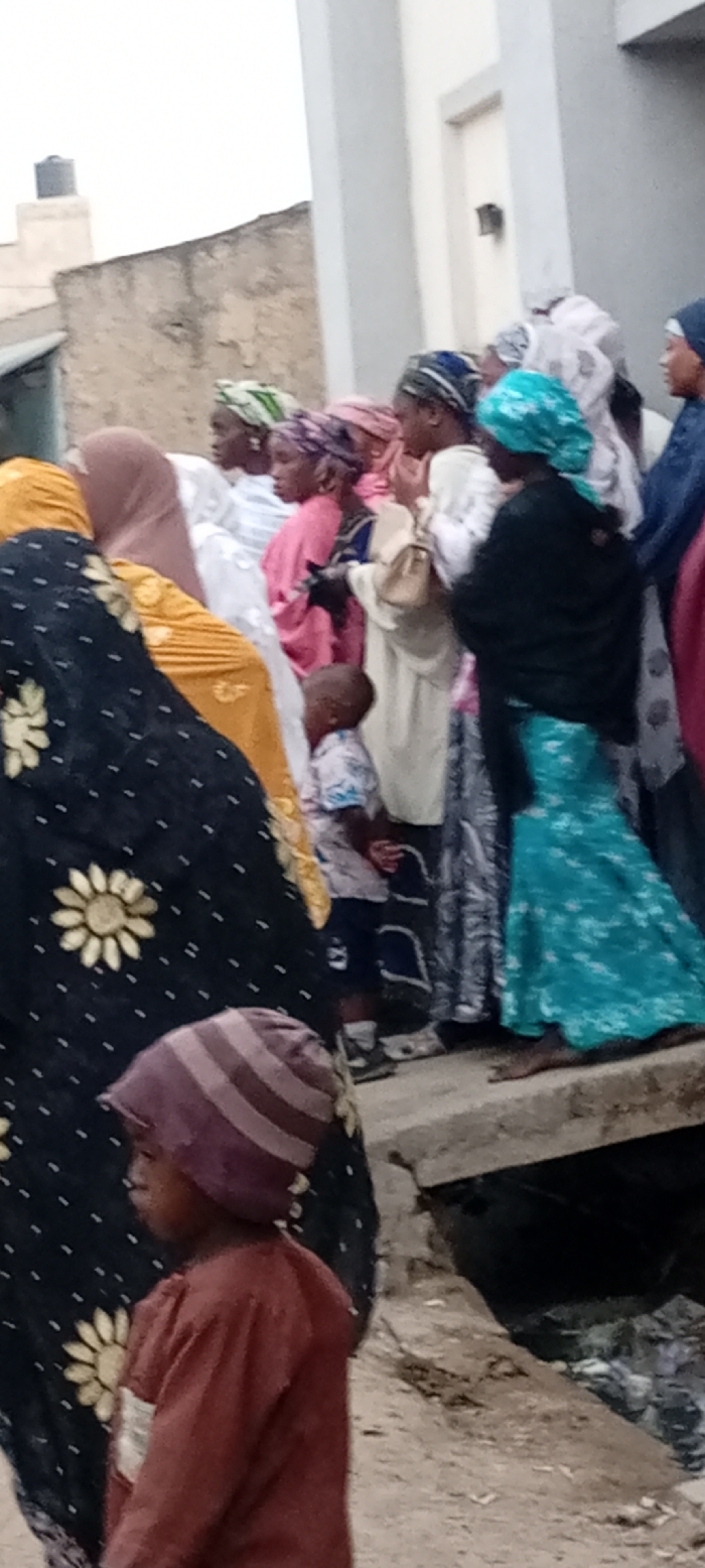 A group of women wearing hijabs and colorful clothes stand near a building. A young boy wearing a blue and white shirt stands among them, while another boy wearing a red shirt and striped hat stands in the foreground. They are standing on some type of concrete surface next to a ditch or other kind of ravine.