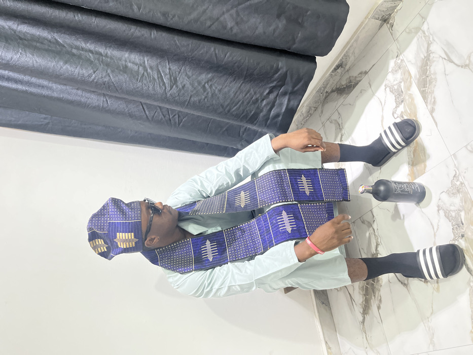 An adult male is seated on a low wooden stool in what appears to be an indoor setting in Joma, Ghana. He is positioned at a slight angle, looking towards his right. The male wears a light green long-sleeved tunic and matching shorts. A blue and gold patterned cap is on his head, complemented by a matching scarf draped over his shoulders. Dark sunglasses are worn. A pink wristband is visible on his right wrist. He wears dark socks and black Adidas slides with white stripes. On the white-tiled floor, between his feet, rests a dark bottle with a partially visible white label. The background features a plain white wall on the left and a dark grey curtain on the right. A grey baseboard lines the bottom of the wall where it meets the patterned white floor tiles.