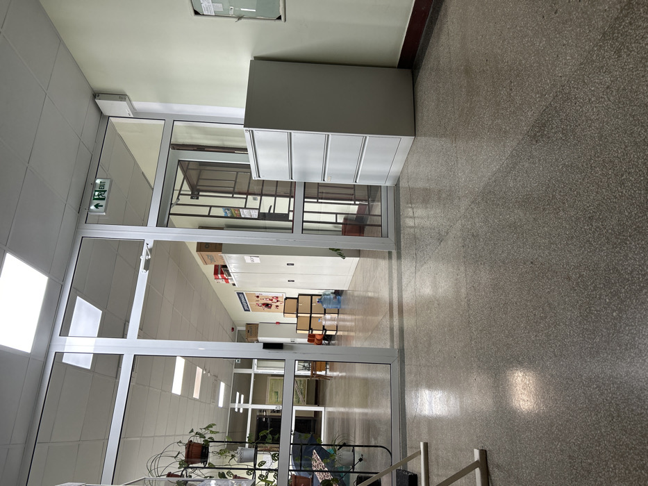 The image depicts an interior scene within a building in Silistra, Bulgaria, specifically a hallway looking into an adjacent room or corridor through a large glass-paneled doorway. The foreground consists of a grey, speckled terrazzo floor. To the immediate left, a portion of a light-colored, possibly metal, A-frame structure is visible. To the right, a light-grey, four-drawer metal filing cabinet is positioned against a light green wall, which also features a dark brown baseboard and a partially obscured notice board. The central element is a white-framed glass doorway system, consisting of a double-door segment and surrounding glass panels. Above the right side of this structure, an illuminated green "EXIT" sign with a directional arrow is mounted, adjacent to a small white rectangular wall-mounted device. Beyond the doorway, the area continues with light green walls and a drop ceiling with multiple rectangular fluorescent light fixtures. To the left, a multi-tiered metal stand holds several potted plants. To the right, along the wall, are multiple light-colored metal storage cabinets or lockers, some with boxes stacked on top. Further into the background, cardboard boxes are stacked near a large blue water cooler bottle on the floor. A doorway with a metal security grille is visible further down the corridor on the right. No individuals are present in the scene.