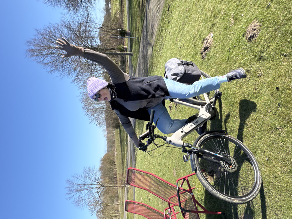 - "An adult female is depicted posing on a light grey Fischer electric bicycle in an outdoor recreational area in Witten, Germany, under a clear blue sky" by FM-ne7Ow2, licensed under CC BY 4.0