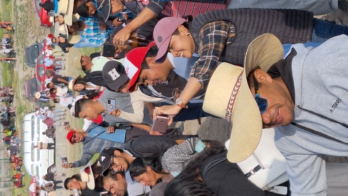 The scene is a crowded public gathering in Sabandía, Peru, located at latitude: -16.448, longitude: -71.474. The setting is a dirt field. Numerous people are present, many wearing hats and casual clothing, and various vehicles are parked nearby. One group of people is gathered around a person who is using a cell phone. A man in a gray hooded sweatshirt and wide-brimmed hat with sunglasses is sitting in the foreground. His face is illuminated by the sun. A woman in a plaid shirt is holding a cell phone to take a picture. A man with a red cap and a woman with a pink cap are standing near each other.
