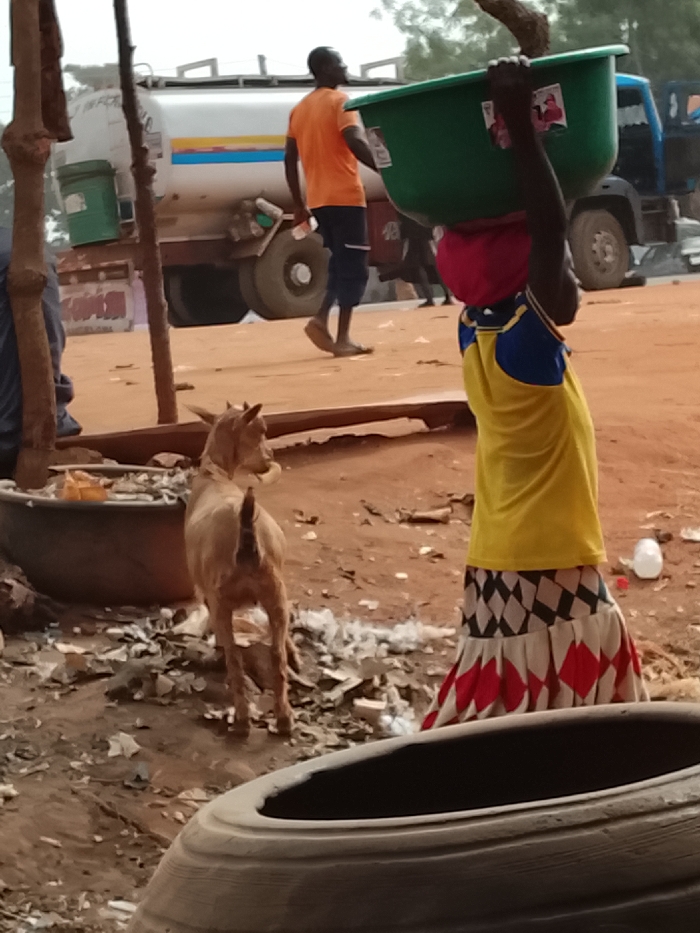 The image depicts an unpaved, reddish-brown dirt area in Katcha, Nigeria, characterized by scattered debris and general disorganization. In the midground-right, a person is visible from the back, carrying a large green plastic basin on their head, supported by a red cloth. This individual wears a yellow and blue short-sleeved top and a long pleated skirt with a red, white, and black diamond pattern. To the midground-left, a light brown goat stands with its back mostly to the viewer, its head turned slightly to the left, positioned near a large, dark basin on the ground that contains refuse. Further back, a man in an orange t-shirt and dark trousers walks to the left, appearing to be barefoot or in light sandals. Behind him, a large white tanker truck with blue and yellow stripes on its side is visible, with a green bucket attached to its side. Partially visible to the tanker's right is the front section of another dark-colored truck. In the immediate foreground, a large, dark, circular object, possibly a tire or a planter, is seen on the bottom right. Two vertical wooden posts stand in the left and central foreground. Debris, including plastic items and litter, is strewn across the ground.