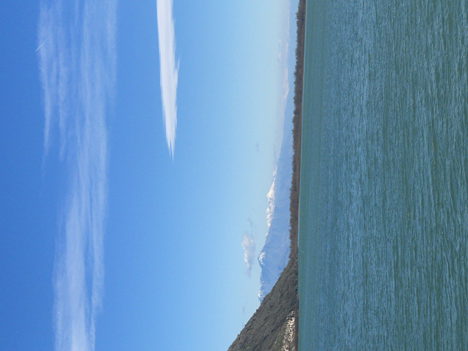 The image displays a panoramic landscape view near Vranjina, Montenegro, focusing on a large body of water under a clear blue sky. The foreground features the turquoise-green water of Skadar Lake, characterized by small surface ripples. To the left, a portion of a steep, rocky hill, sparsely covered with dull green vegetation, descends into the lake. Across the lake, a distant strip of low-lying land densely covered with what appears to be bare trees or shrubs forms a dark brown-green horizon line. Behind this landmass, a range of mountains with snow-capped peaks is visible under the expansive blue sky. The sky contains scattered wispy white clouds, with a prominent elongated white cloud situated in the mid-right section and a faint aircraft contrail visible in the upper left. No individuals or man-made structures are observed within the scene.