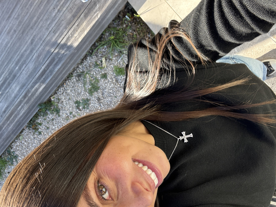 A young woman is captured in a high-angle outdoor selfie in Antibes, France. Her dark brown hair, illuminated by sunlight, cascades over her right shoulder and partially covers the upper left of the frame. She displays a wide, open-mouthed smile, revealing white teeth and faint lines around her brown eyes. She is wearing a black ribbed long-sleeved top. A silver chain necklace with a prominent silver cross pendant rests against her chest. Below the frame of her torso, light blue denim jeans and a portion of a black and white sneaker are visible. The background consists of a weathered wooden fence with horizontal planks in the upper right, a gravel ground area with sparse green vegetation, and light-colored paved ground in the lower right. Bright sunlight creates distinct highlights and shadows across the scene.