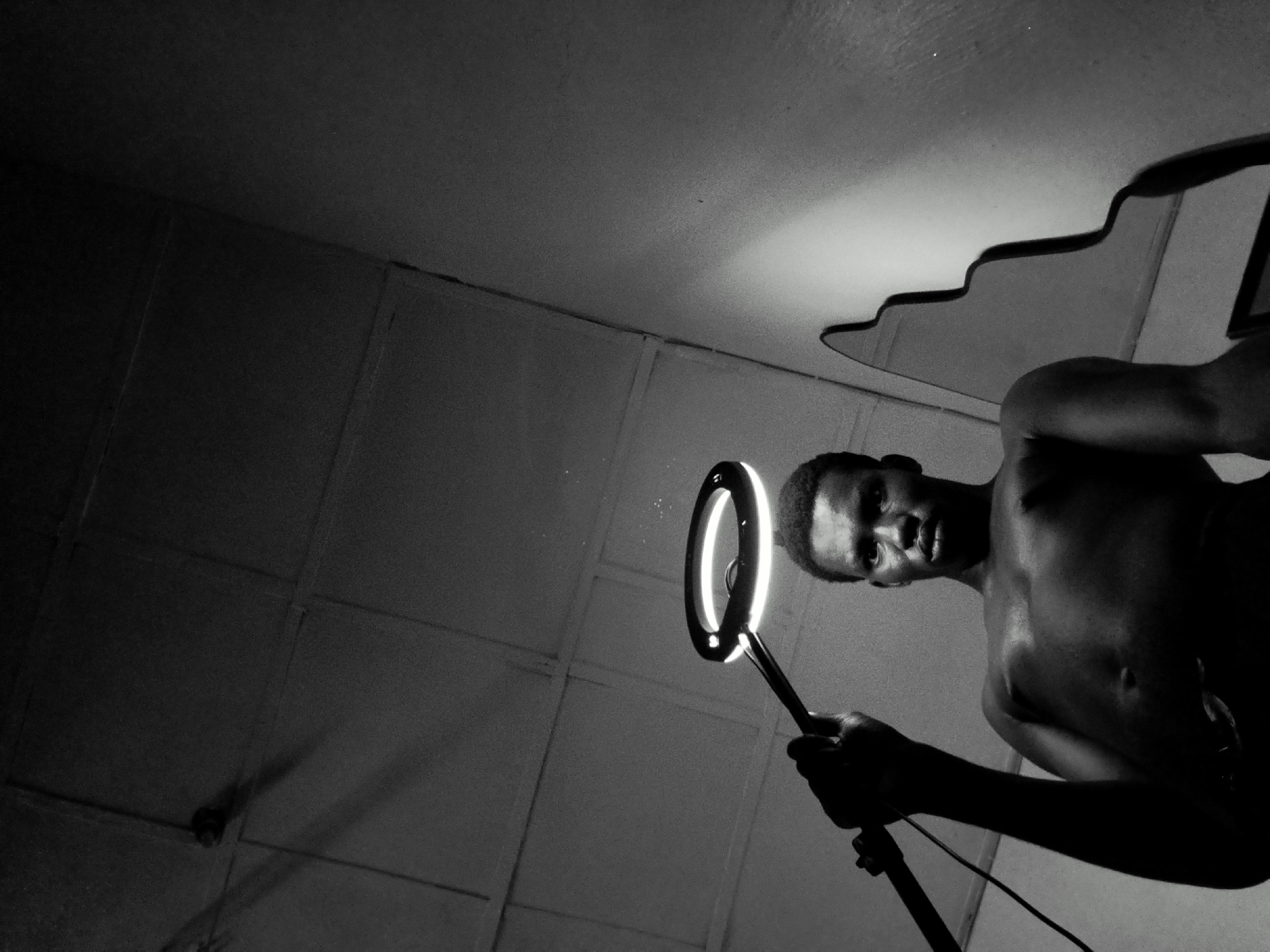 A low-angle, black and white photograph shows a shirtless man holding a ring light. The room appears to be dimly lit except for the intense light from the ring. The man's face is partially illuminated, showing his features as he looks down at the camera. Behind him, a section of the ceiling can be seen, along with what appears to be the edge of a mirror or another reflective object. The location of the image is Keffi, Nigeria.