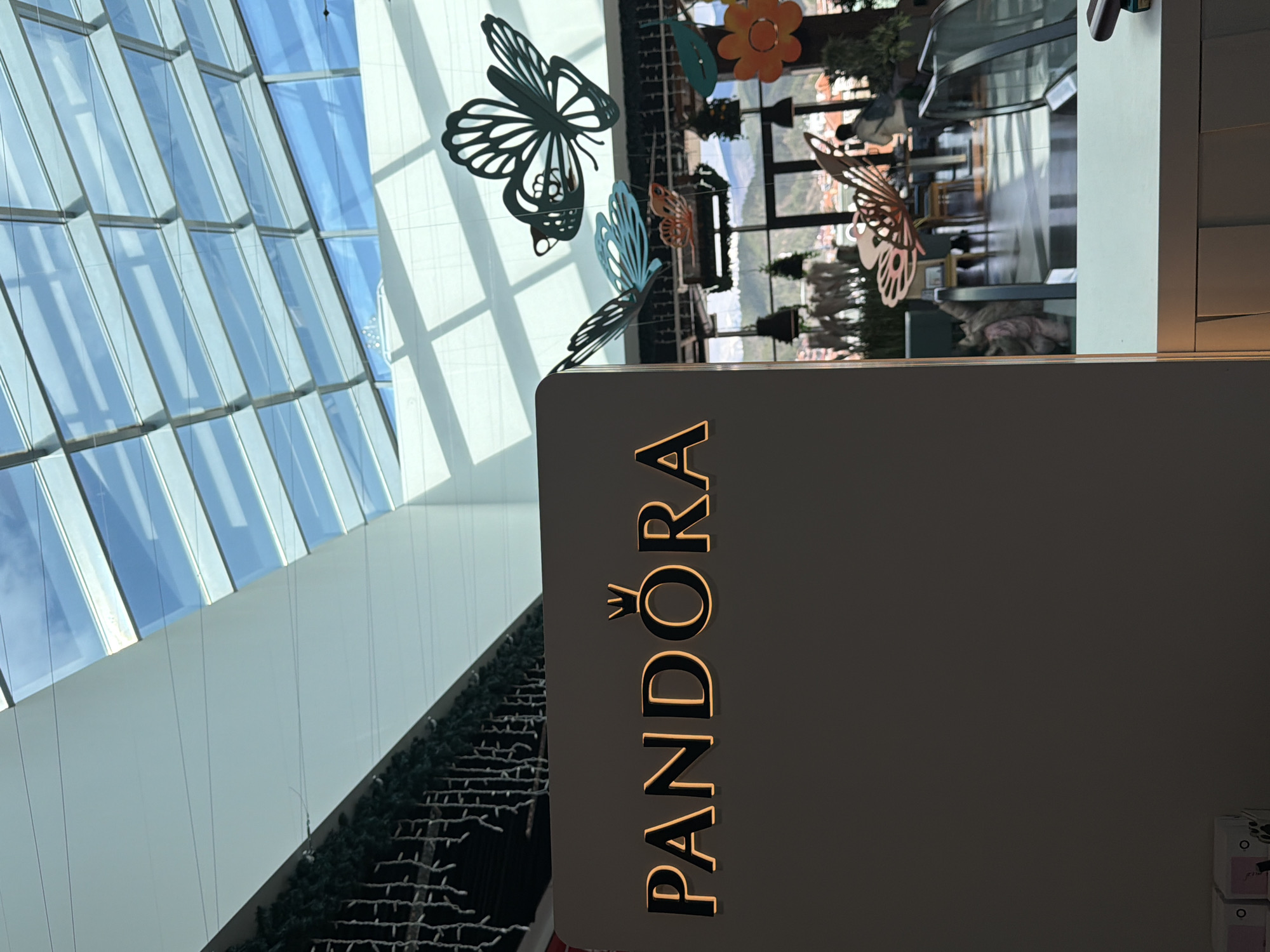 The scene depicts the interior of a modern commercial complex, likely a shopping mall, located in Blagoevgrad, Bulgaria. In the left foreground, a dark, matte surface displays the illuminated "PANDORA" logo with a distinct crown symbol above the 'O', rendered in a gold-amber glow. Below this, partially visible at the bottom left, are stacked white boxes. The upper portion of the image features a large, segmented glass skylight ceiling with a visible metal framework, through which a bright blue sky and scattered white clouds are observed. Below an overhead structural beam on the upper left, green garland adorned with white string lights is suspended. The mid-ground and background reveal a spacious area decorated with multiple large, stylized cutouts of butterflies (black, blue, and a pinkish-brown hue) and an orange flower, suspended from the ceiling. Large windows in the background provide an expansive view of a cityscape featuring buildings and distant mountains under a clear sky. Within the indoor space, below these windows, is a seating area with tables, chairs, and potted green plants, consistent with a cafe or food court environment. Several indistinct human figures are present in the background. One individual, wearing a light-colored jacket and a backpack, is observed walking away from the camera, positioned near a descending escalator section visible on the right side of the frame. Another seated figure is discernible further back in the cafe area. The space is illuminated by a combination of natural light from the skylight and artificial overhead fixtures.